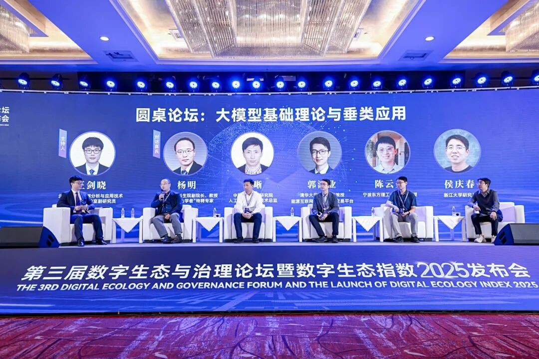 在圆桌论坛环节,山东大学本科生院副院长、教授杨明,中国电力科学研究院人工智能研究所技术总监陈晰,清华大学电机系副教授郭鸿业,宁波东方理工大学助理教授陈云天,浙江大学研究员侯庆春围绕“大模型基础理论与垂类应用”主题展开探讨。圆桌论坛由实验室副研究员王剑晓主持。